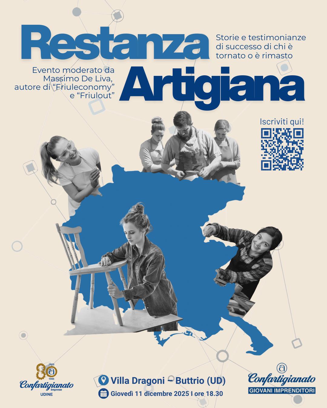 "La Restanza" nasce dalla volontà di dare voce a chi oggi sta concretamente reinventando il fare impresa nel nostro territorio. L'evento celebra le storie, le visioni e le testimonianze di quegli artigiani e imprenditori che hanno scelto di restare in Friuli, di tornarci o di costruire qui il proprio futuro professionale.Sarà un momento di riflessione sul valore della permanenza, intesa non come immobilismo, ma come scelta attiva di radicamento e innovazione, capace di generare valore economico, sociale e culturale per l'intera comunità friulana.